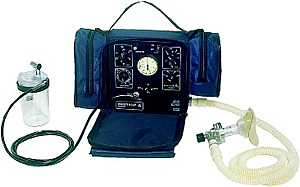 Автоматический дыхательный аппарат для предоставления искусственной вентиляции легких при неотложной реанимации пациента, постигнувшим дыхательной недостаточностью. Аппарат позволяет управляемую вентиляцию пациентов весом с 9 kg по 110 kg. Он оснащен ингаляционной системой для лечения кислородной терапией и струйным отсосом жидких секретов.