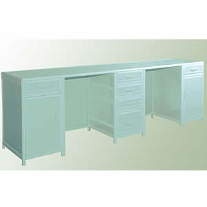 Имеет 6 встроенных тумб с выдвижными ящиками и полочками из ламинированной
